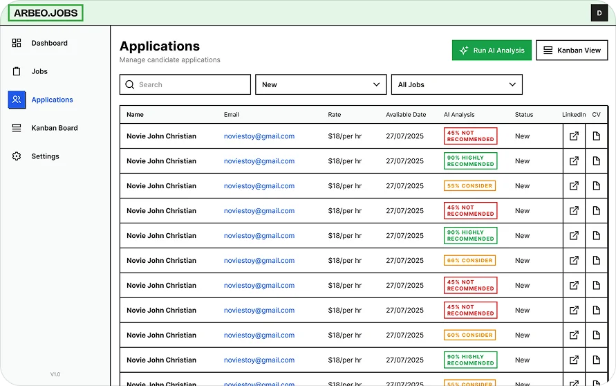 Arbeo is a lightweight applicant tracking system built for teams who don't need enterprise complexity. A visual Kanban pipeline keeps every candidate organized. AI parses resumes, scores matches, and surfaces who's worth your time. Schedule interviews, collaborate with your team, and move fast — without losing track of anyone.