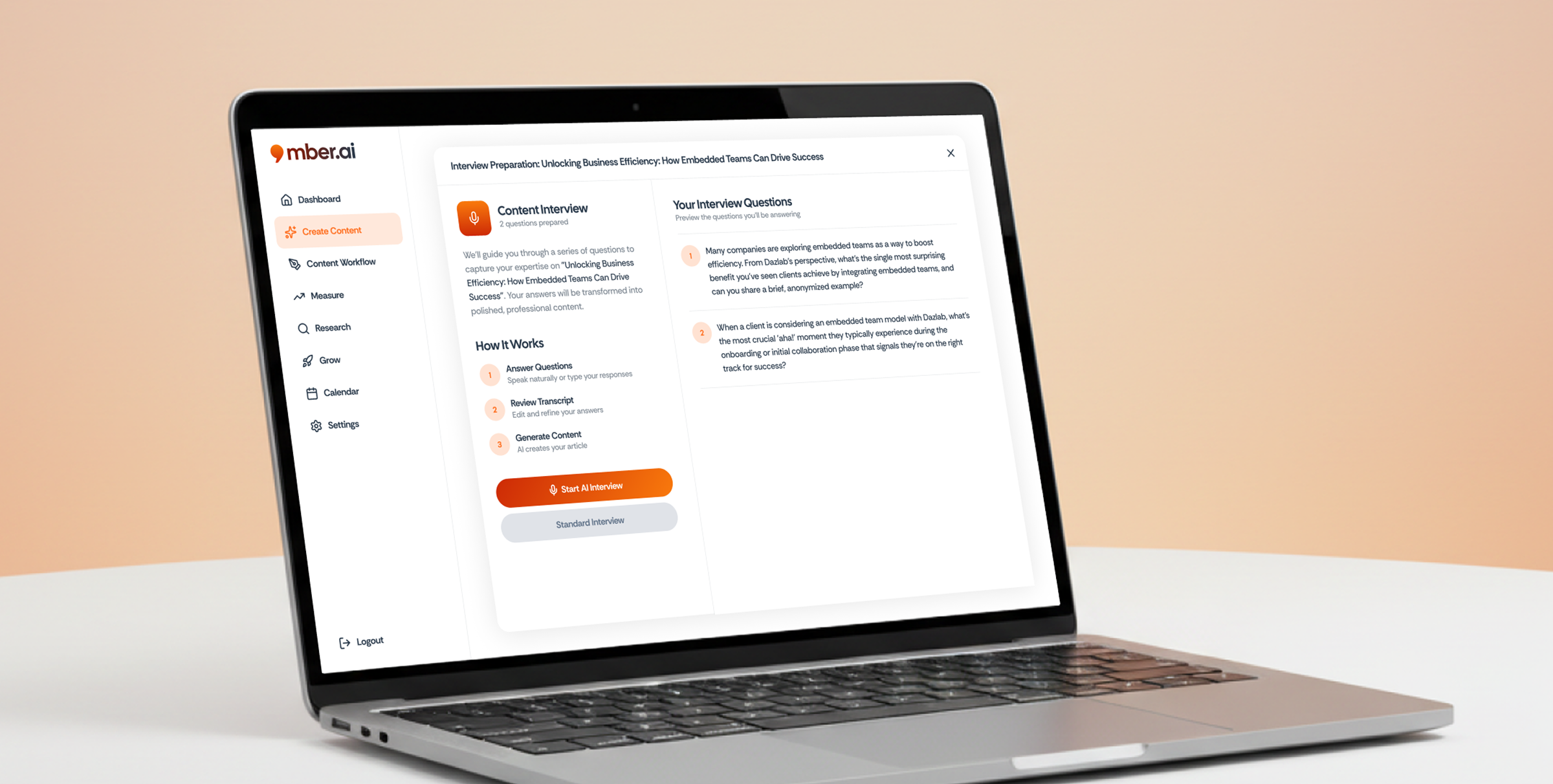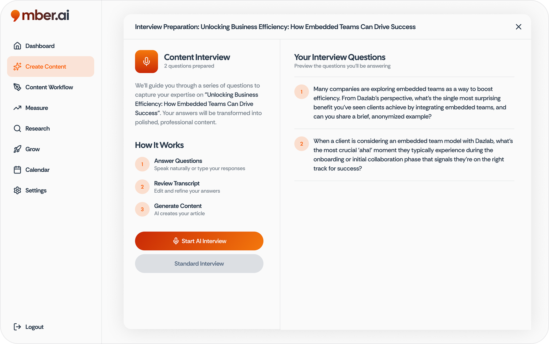Mber finds the topics your audience is actually searching for, then interviews you about them using AI-guided voice conversations. No blank pages. No writing. Your answers become fully structured articles with images, optimized for search engines and AI discovery, and published to your site in one click. WordPress, Webflow, Shopify, Squarespace, Wix — all connected.